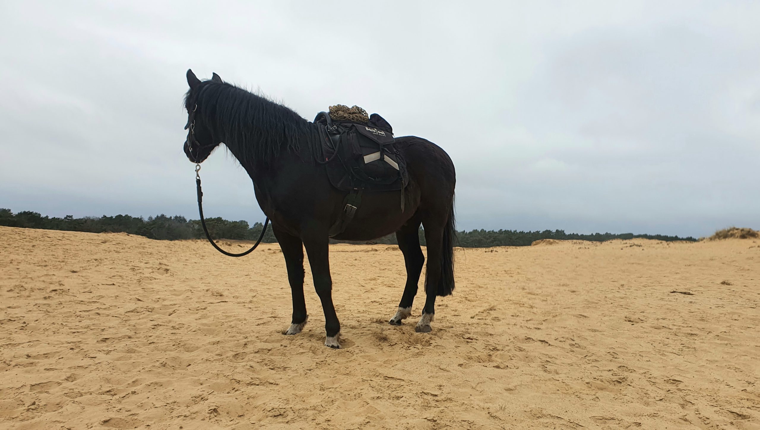 Op advies van ervaren ‘trekkers te paard’ kies ik deze eerste keer nog maar niet voor tentje en prikpaaltjes met een lintje. Dat blijkt een goed advies! Corvo heeft ’s nachts zicht op andere paarden en omdat die onverstoorbaar hun gang gaan, besluit hij dat het blijkbaar een veilige plek is.